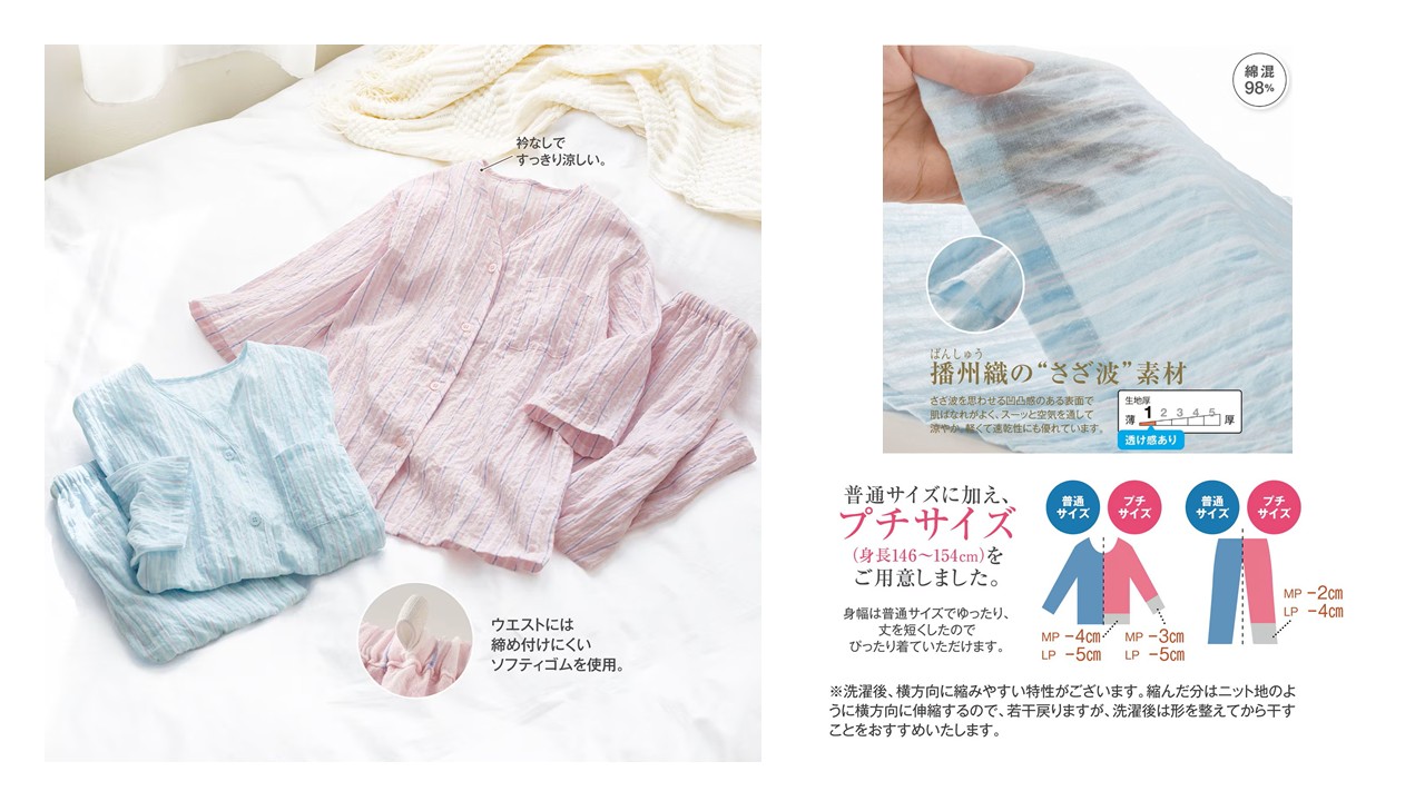 左『さざ波素材の前開きパジャマ』(カラー:ピンク/ライトブルー)