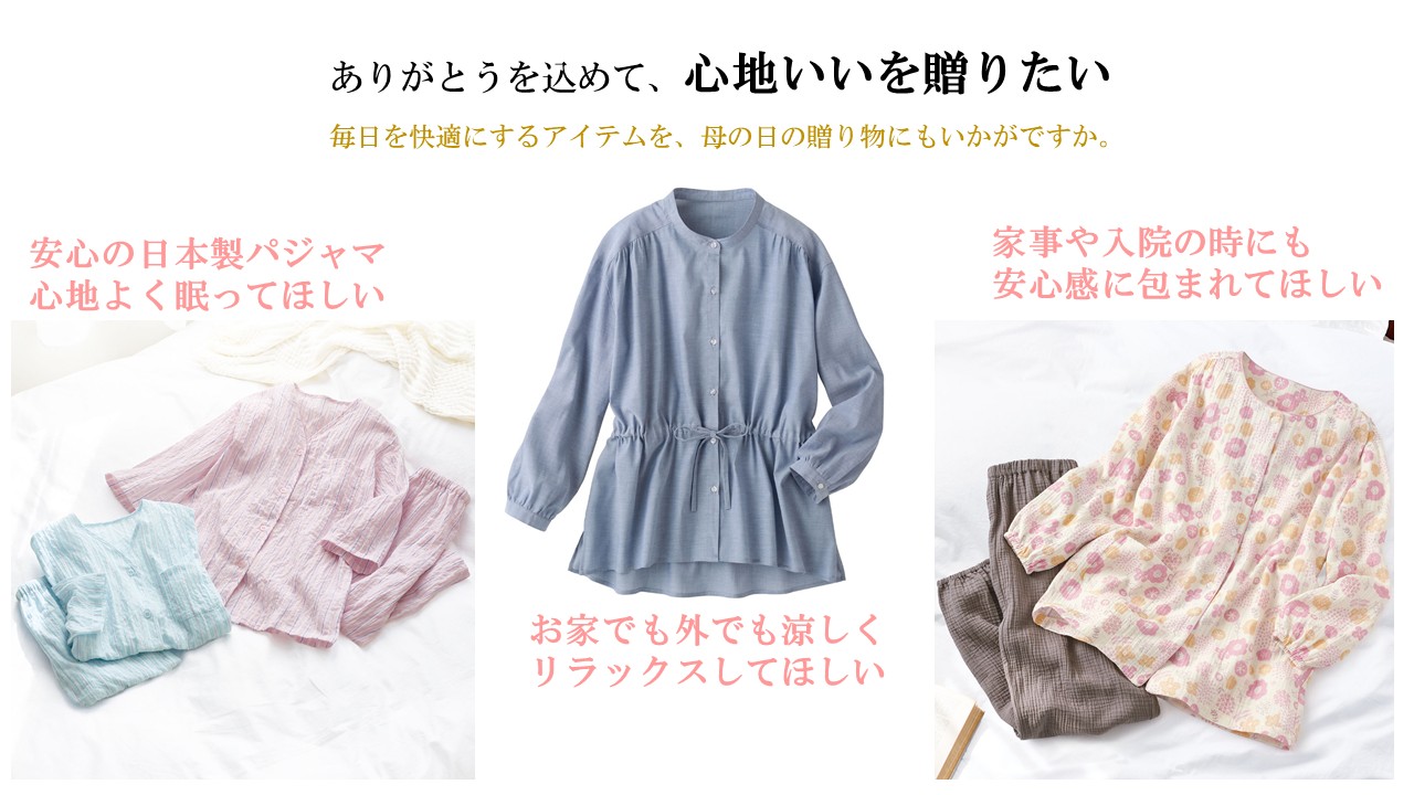 株式会社セシール(本社:東京都新宿区)は、『さざ波素材の前開きパジャマ』、『夏のコットン100% パジャマにも使えるシャツ』、「胸二重仕立てで透けにくい楊柳ガーゼパジャマ」を3月27日より販売開始しました。毎日頑張るお母さんに「ありがとう」の気持ちを込め、母の日ギフトとして贈ってみませんか?