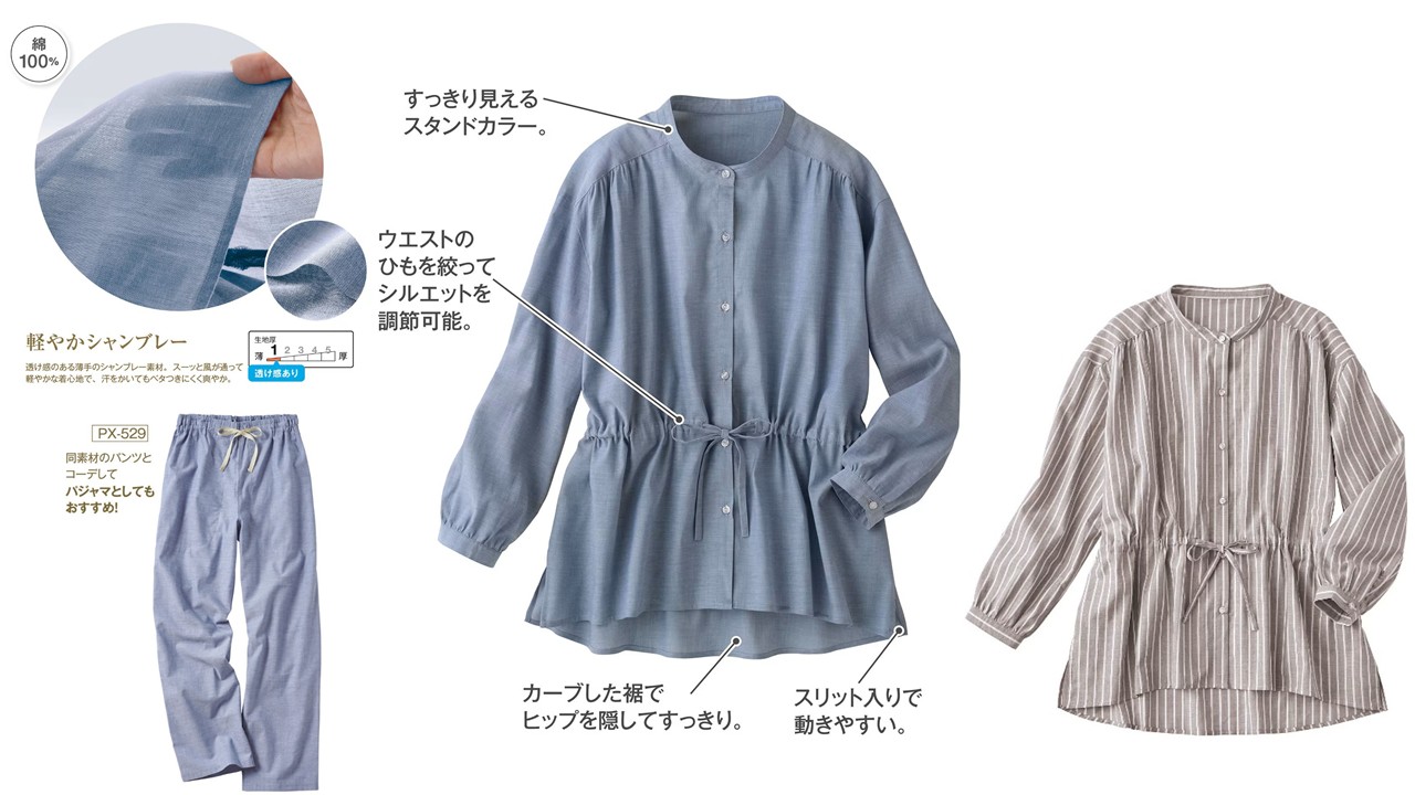 軽やかでさらっと涼しい着心地が好評の定番ルームパンツ(PX-529)と同素材のシャツがあれば、パジャマとしてはもちろん、羽織としても活用でき、より便利でお客様にも喜んでいただけるのではないかという想いから開発に至りました。