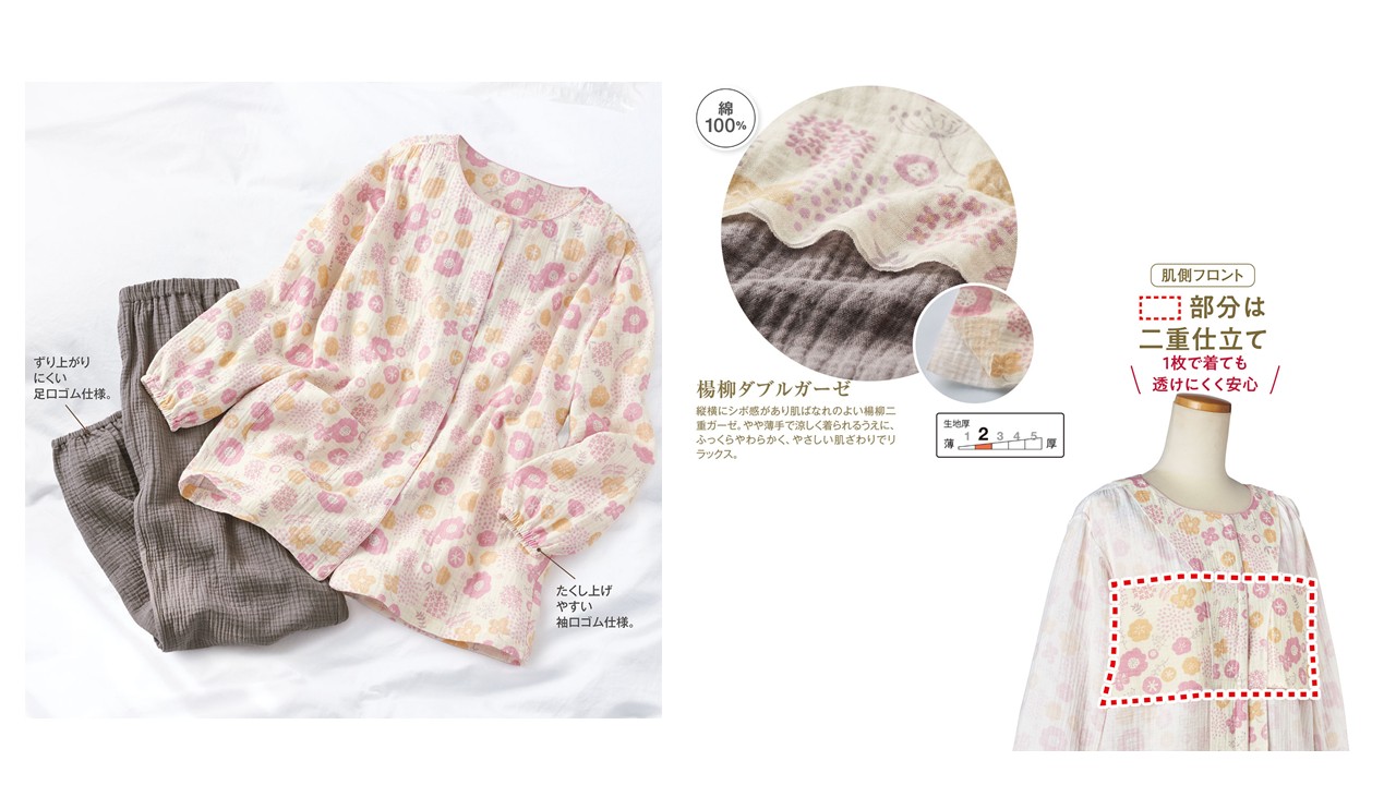 ■『胸二重仕立てで透けにくい楊柳ガーゼパジャマ』
