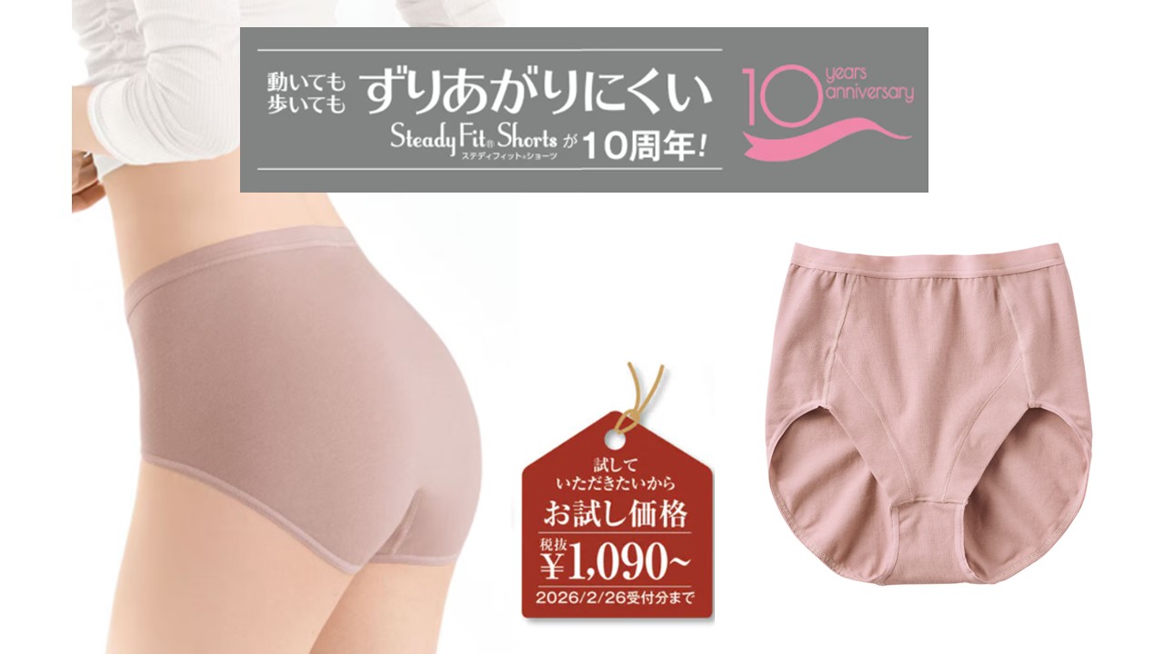 株式会社セシール(本社:東京都新宿区)は、シリーズ累計販売枚数29万枚を突破(2025年8月末現在)した「ステディフィット®ショーツ」の発売10周年を記念し、新タイプ「ステディフィット®ショーツ(はきこみ丈深め・シンプルゴムタイプ)を11月27日に販売開始しました。独自の立体設計による、動いても歩いてもずり上がりにくい快適なフィット感をぜひお試しください。