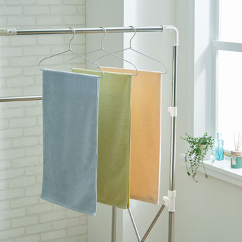 幅はフェイスタオル、長さはバスタオルと同じ。バスタオルよりも省スペースで干せて、収納スペースも取りません。女性やお子様なら、ハンガーバスタオルで充分にふき取れます。