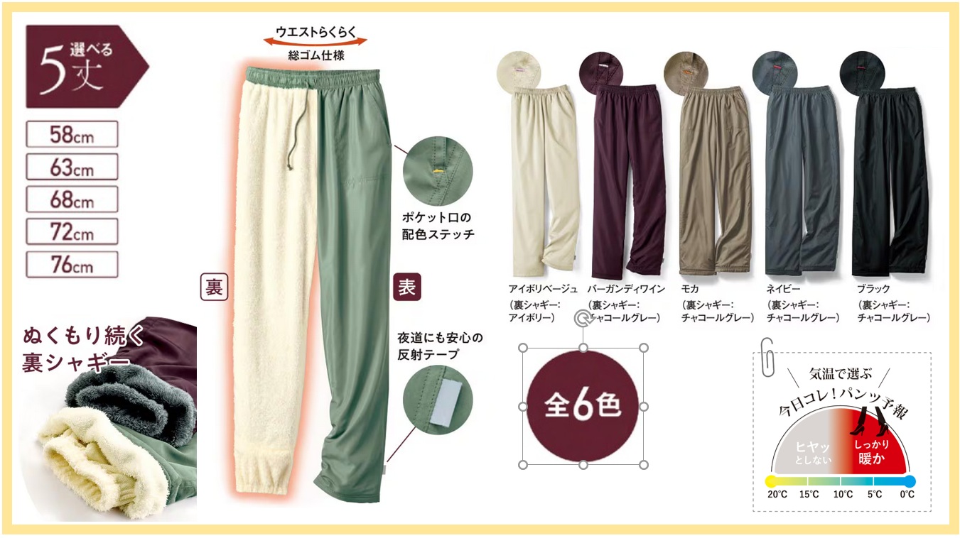 全6色、選べる股下5丈展開なので、お好みの色をジャストサイズでお選びいただけます!