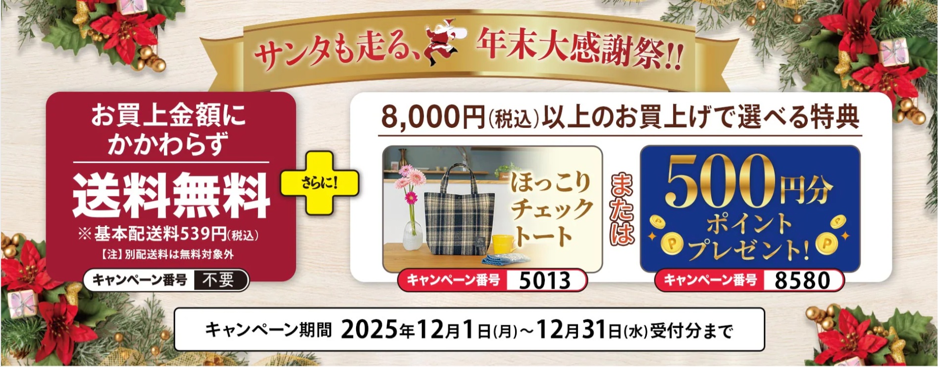キャンペーン番号は不要。期間中は何度でも、お買上金額にかかわらず、基本配送料無料(別配送料は無料対象外)