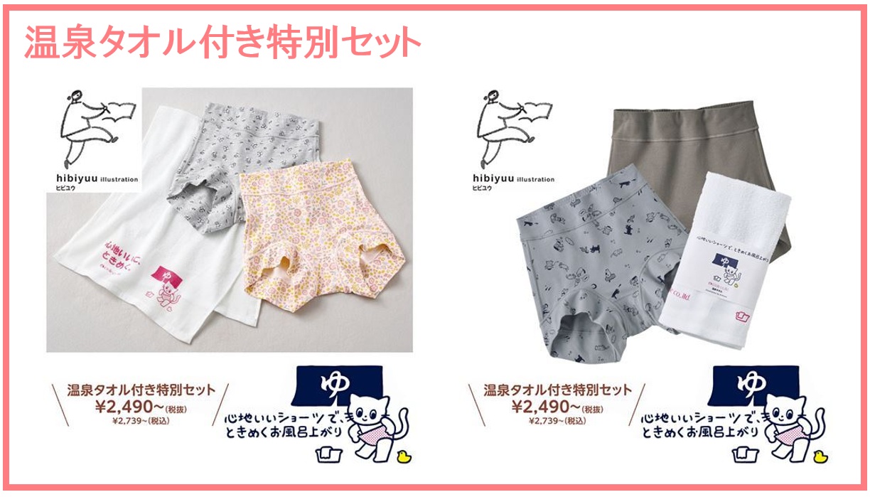 セシールの『すっぽり包み込む、はみ出しにくいショーツ』が販売開始から1年で1万枚突破! 感謝の想いと、セシール新ブランドスローガン「心地いいに、ときめく。」をテーマに、イラストレーターhibiyuuさんデザインのプリント柄と、温泉タオル付き特別セットを販売中!