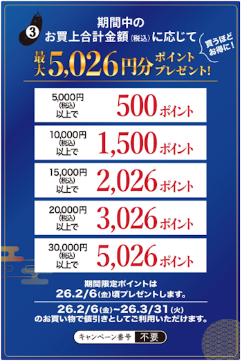 【特典③】 期間中のお買上合計金額(税込)に応じて最大5,026円分ポイントプレゼント!